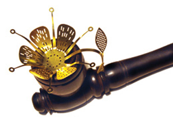 As for the rest of what makes him interesting, well, where to begin? Since his 2001 public debut — which involved the neo-Duchampian conversion of a Philippe Starck chair into a lamp — he’s attracted attention with a range of provocative projects like his Killer Ring, with the stone set so that the sharp end points outward; the Money Pad, a stack of 100-dollar bills bound with notepad glue; and the 9/12 Airport Giftshop, for the Terminal 5 exhibition at JFK Airport (which later became infamous when it was shut down immediately after a reportedly raucous opening party). He cut Karim Rashid’s book I Want To Change The World into a gun shape; borrowed (okay, took) Burberry’s famous plaid pattern to make buttons; and in a collaboration with Ken Courtney (of fashion line Ju$t Another Rich Kid), made gold-plated versions of a coffee stirrer that McDonald’s had discontinued because people were apparently using it as a coke spoon. One of his most recent projects was The Wrong Store, in New York’s Chelsea neighborhood. Wong and Gregory Krum (The Cooper-Hewitt National Design Museum’s Director of Retail) lined up an amazing array of product-artists for a collection that addressed the shop as gallery and the gallery as shop. Art fans and potential shoppers who turned up for the opening eventually figured out that, to top it off, the store was never going to open.